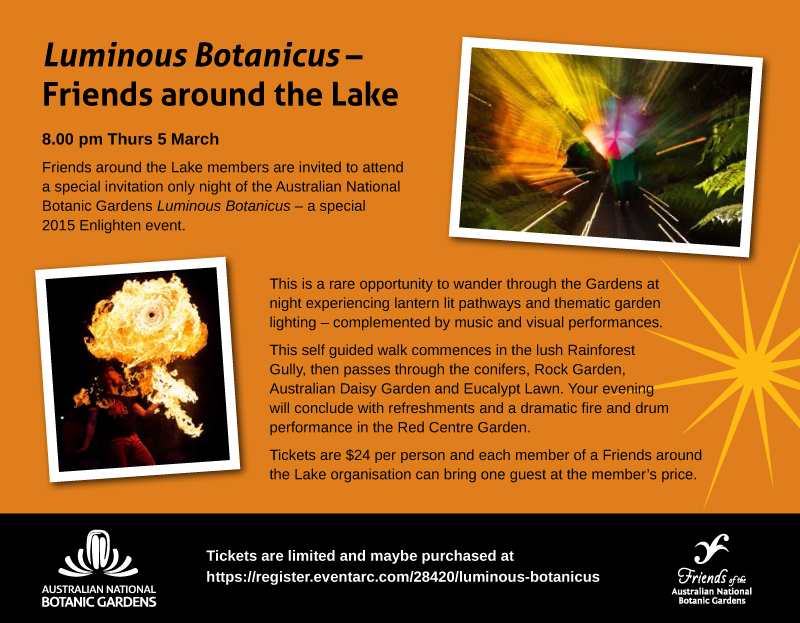 Friends around the Lake members are invited to attend a special invitation only night of the Australian National Botanic Gardens Luminous Botanicus – a special 2015 Enlighten event.