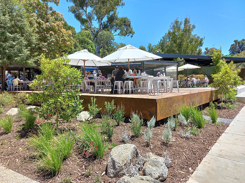The new Friends Lawn alongside the expanded cafe deck stretches out invitingly – but is still behind barriers while the new turf establishes itself!