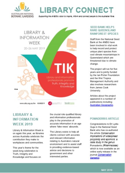 The May 2019 edition of Library Connect (PDF, 360 kb) incudes: Library and Information Week 2019 (20 to 26 May) Seed Bank helps Rare Queensland…